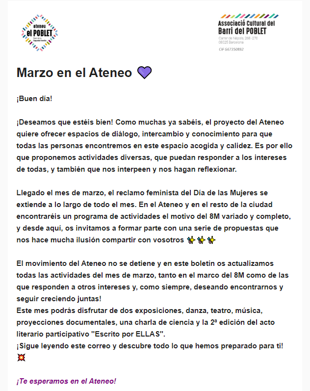 El movimiento del Ateneo no se detiene y en este boletín os actualizamos todas las actividades del mes de marzo, tanto en el marco del 8M como de las que responden a otros intereses y, como siempre, deseando encontrarnos y seguir creciendo juntas!