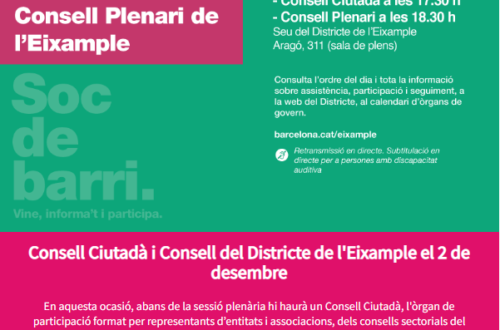 El dijous 7 d’abril a les 18.30 h celebrarem l’Audiència Pública del Districte de l’Eixample. La sessió es realitzarà presencial i també es podrà seguir per streaming al següent enllaç: https://youtu.be/9joNCceOPEw .