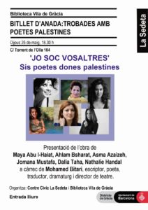 – La conferència sobre l’obra de les poetes palestines que es farà el proper dijous 26 de maig, a les 18.30 h, a la Biblioteca Vila de Gràcia (Torrent de l’Olla, 104), a càrrec de Mohamed Bitari,  escriptor,  poeta i dramaturg i director teatral.