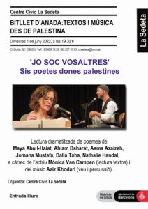 – L’espectacle ‘Poemes i música des de Palestina’ que es farà el proper dimecres 1 de juny, a les 19.30 h, al centre Cívic La Sedeta (Sicília, 321), a càrec de l’actriu Mònica Van Campen (lectura dramatitzada) i del músic Aziz Khodari (veu i percussió).