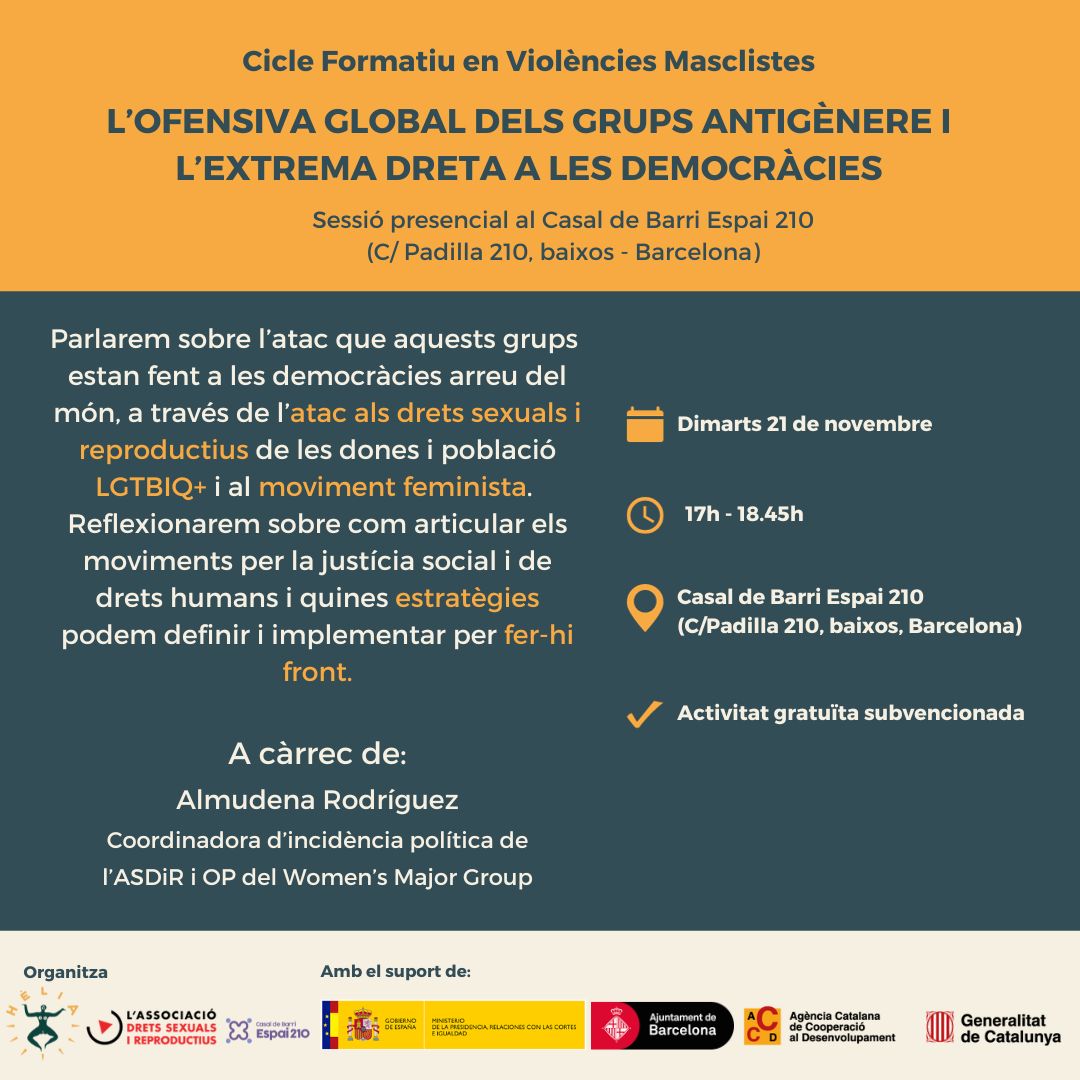 Hola a totes!Ja tenim aquí la sessió d’aquest mes del Cicle Formatiu en Violències Masclistes, que tindrà lloc el dimarts dia 21 de novembre, de 17h a 18.45h.En aquesta ocasió parlarem sobre l’ofensiva global dels grups antigènere i l’extrema dreta a les democràcies. Ho farem de la mà d’Almudena Rodriguez, coordinadora d’incidència política de l’Associació de Drets Sexuals i Reproductius i OP del Women’s Major Group.Al llarg de la sessió compartirem coneixements sobre els atacs que aquests grups antigènere i partits polítics d’extrema dreta estan fent contra totes les democràcies del món. Parlarem sobre com ho fan mitjançant l’atac frontal als drets sexuals i reproductius de les dones i de la població LGTBIQ+ i al moviment feminista, amb l’objectiu d’articular els moviments de defensa dels drets humans i definir i implementar estratègies per fer-hi front. La sessió serà en format presencial, al Casal de Barri Espai 210 (Carrer Padilla, 210, baixos).