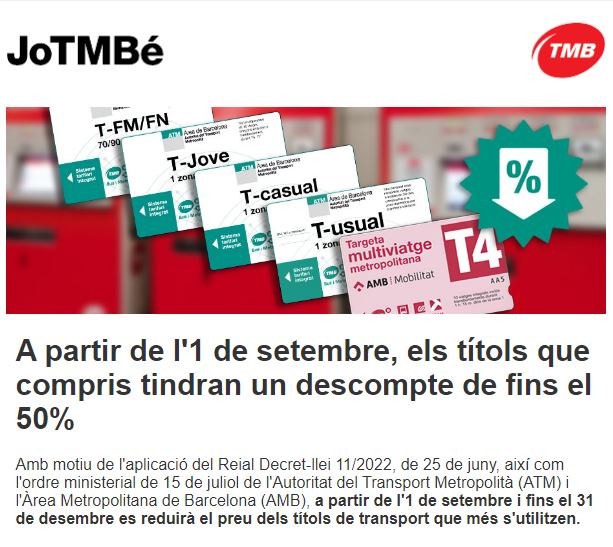 Amb motiu de l’aplicació del Reial Decret-llei 11/2022, de 25 de juny, així com l’ordre ministerial de 15 de juliol de l’Autoritat del Transport Metropolità (ATM) i l’Àrea Metropolitana de Barcelona (AMB), a partir de l’1 de setembre i fins el 31 de desembre es reduirà el preu dels títols de transport que més s’utilitzen.