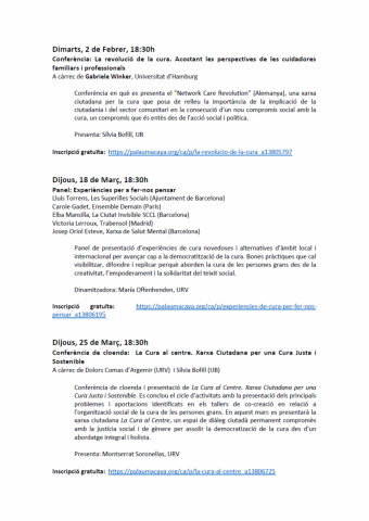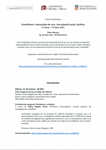 Conferència María Ángeles Durán “Pandemia y Cuidados”, Dijous 21 de gener 18:30h. Cicle d’activitats “Envelliment i necessitats de cura. Una qüestió social i política” Palau Macaya (Barcelona)